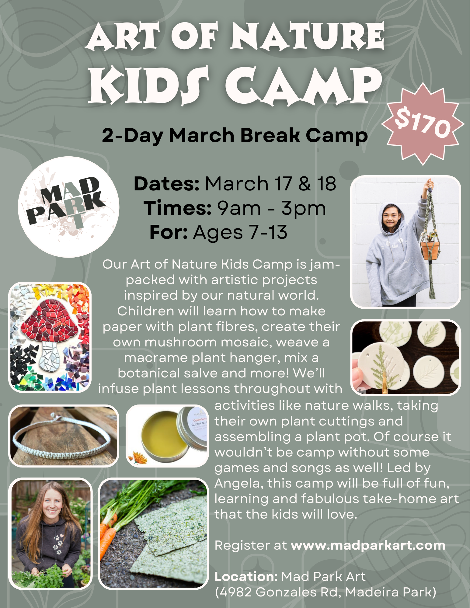Our Art of Nature Kids Camp is jam-packed with artistic projects inspired by our natural world. Children will learn how to make paper with plant fibres, create their own mushroom mosaic, weave a macrame plant hanger, mix a botanical salve and more! We’ll infuse plant lessons throughout with activities like nature walks, taking their own plant cuttings and assembling a plant pot. Of course it wouldn’t be camp without some games and songs as well! Led by Angela, this camp will be full of fun, learning and fabulous take-home art that the kids will love.